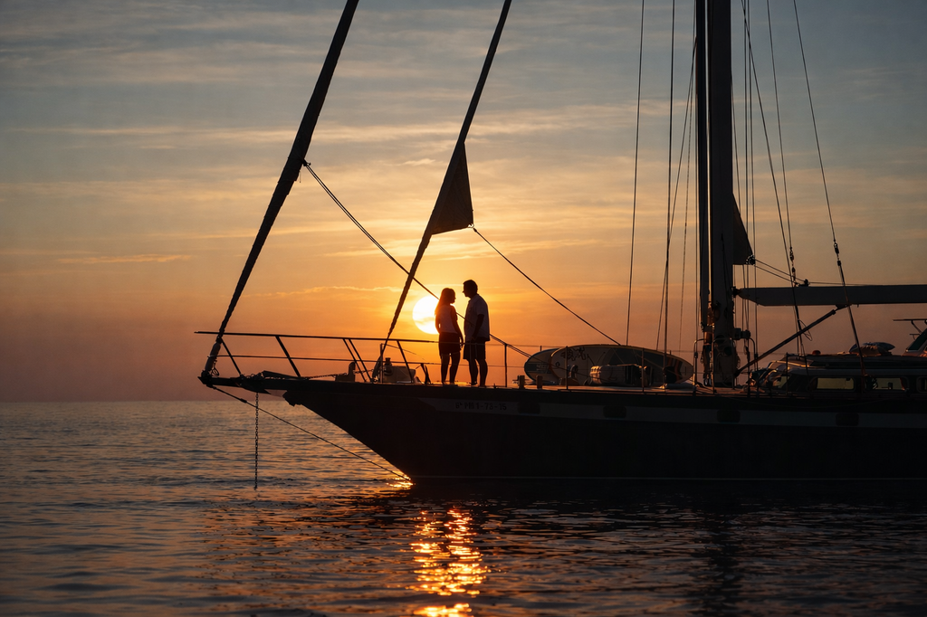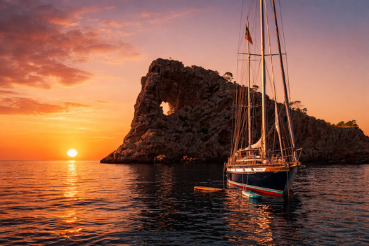 Vom exklusiven Hafen Port d’Andratx aus segeln Sie in einen unvergesslichen Sonnenuntergang, bei dem sanfte Navigation, Meeresbrise und goldenes Licht eine besonders stilvolle Atmosphäre schaffen.