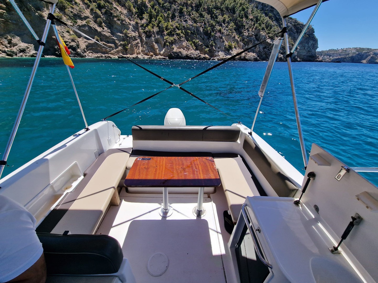 The rental of our rigid motorboat, this open-style vessel, offers a spacious aft area. Its main highlight is a large cabin that allows you to sleep in coves and spend the night on board. It also features several large storage compartments for all your belongings and a generous sunbathing area at the bow.