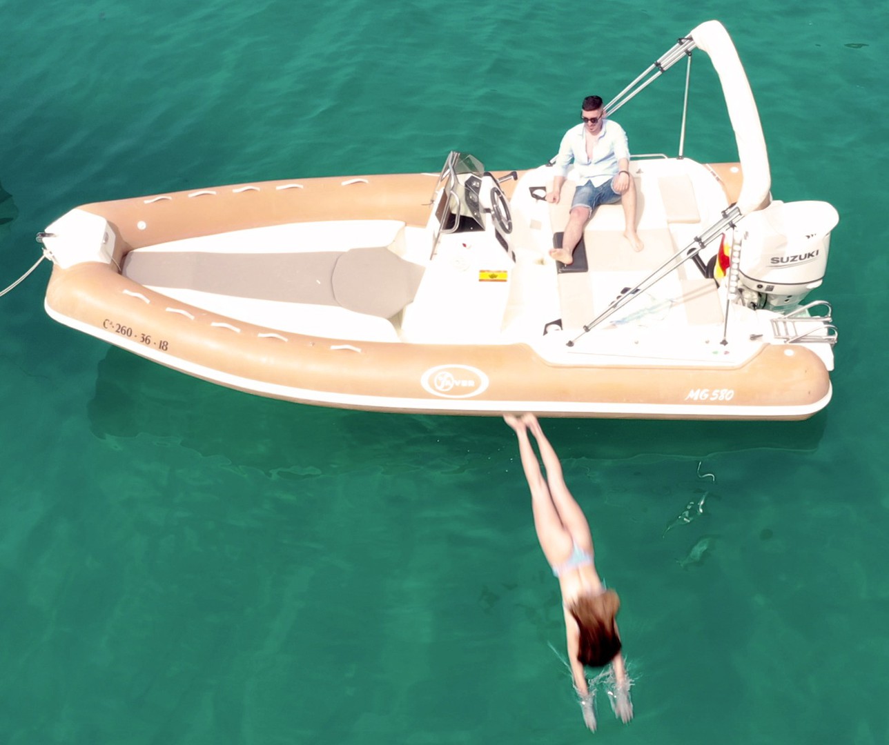 Elegant and versatile semi rigid boat, perfect for navigating with a basic boating license, as it complies with the limits allowed by such certification. Measuring 6.00 m in length and equipped with a powerful 115 HP engine, it is fast, stable, and practical. Ideal for outings with family or friends, exploring the caves of the Serra de Tramuntana, visiting Dragonera Island, and anchoring in paradisiacal beaches. It has a maximum capacity of 12 people.