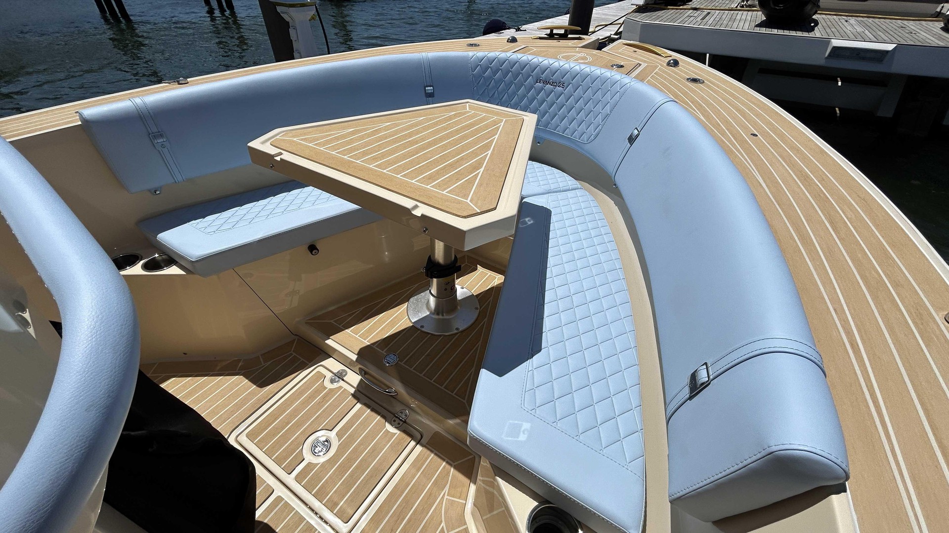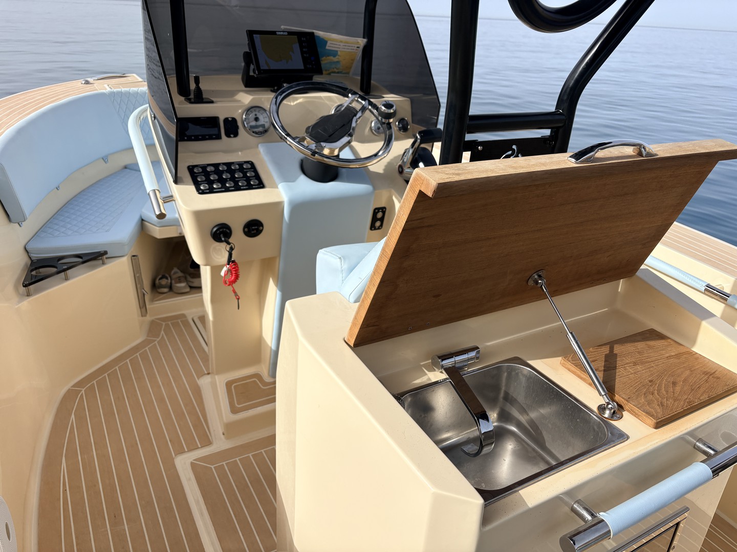 It comfortably accommodates up to 10 people, offering a spacious and practical layout with premium features designed to enhance your day at sea. These include a large sunshade (bimini top), wireless music system with Bluetooth connectivity for your smartphone, cooler, and electric anchor windlass.