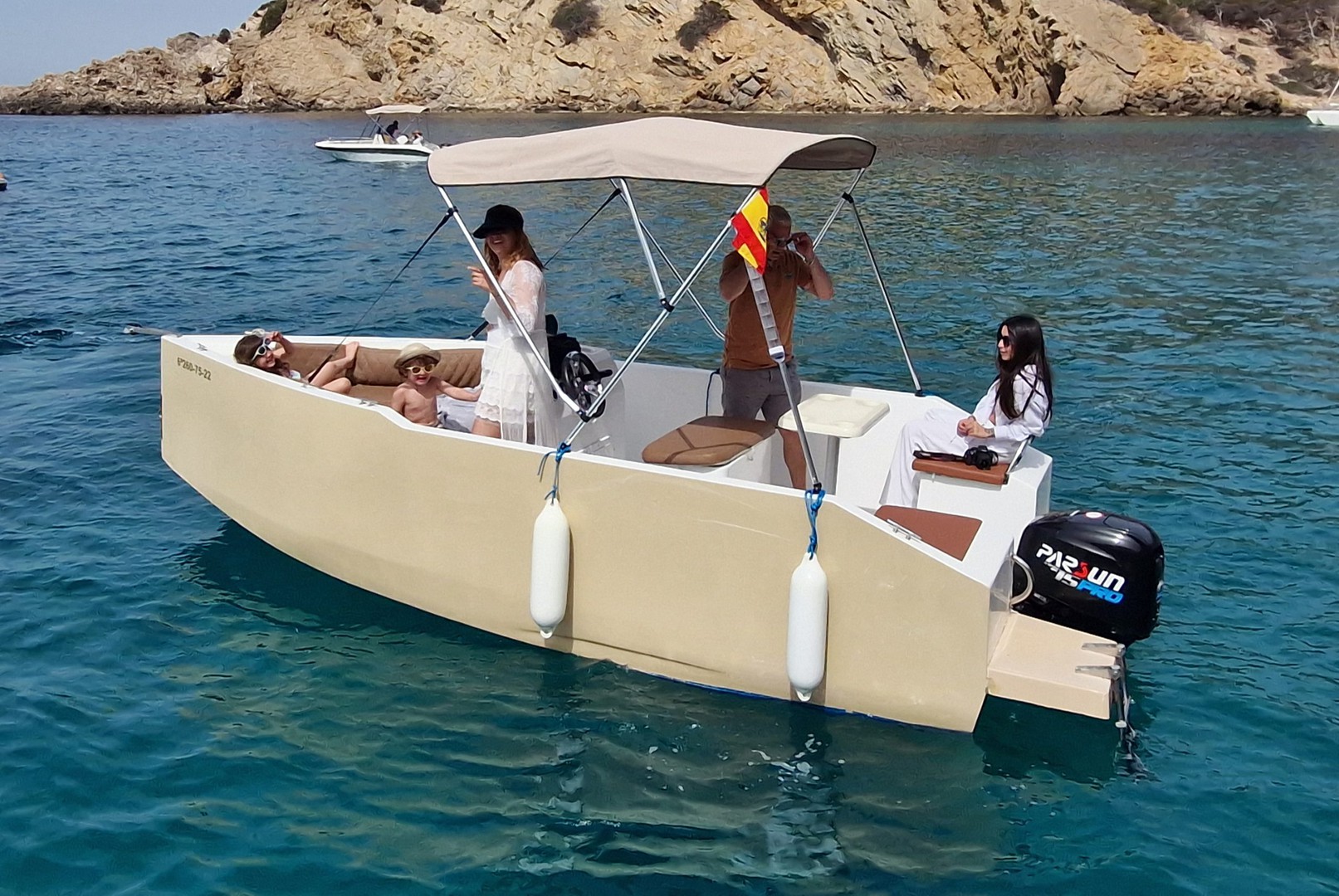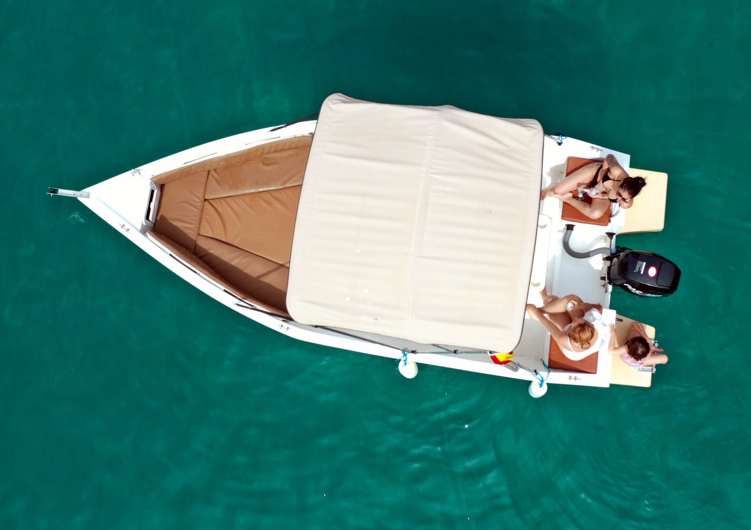 5.00 m long boat with a 15 HP engine, making it our ideal rigid motorboat for all types of clients, as no boating license is required. It has a maximum capacity of 6 people. A simple, practical boat with features that will make your day unbeatable, such as a large sunshade and wireless music by connecting your smartphone via Bluetooth.
